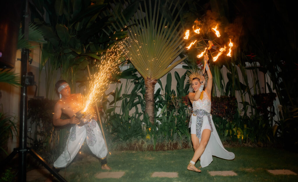 A pak přišlo překvapení: ohnivá show. Rytmické tance, světla a síla ohně rozproudily energii celého večera. Hosté byli fascinovaní a nadšení. Atmosféra se proměnila, a večer mohl pokračovat.